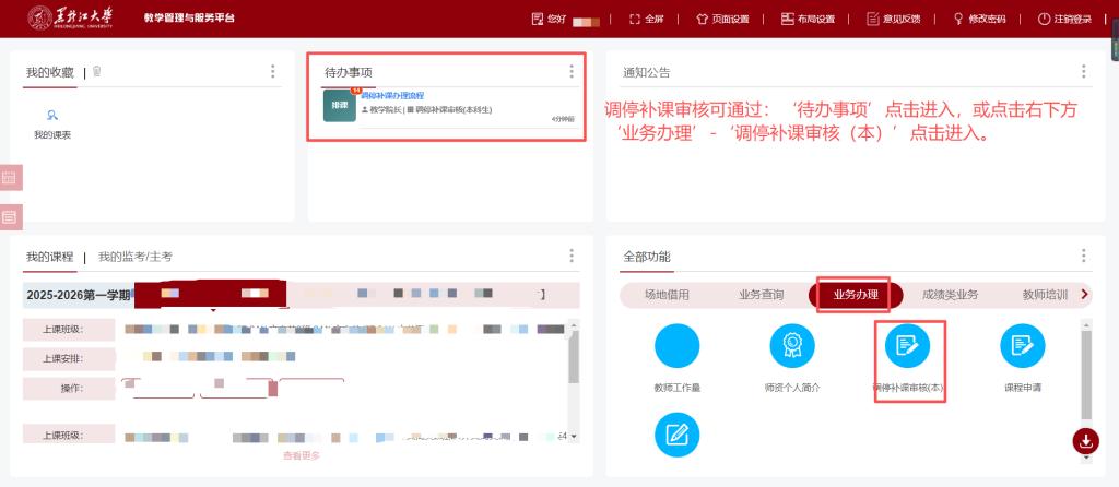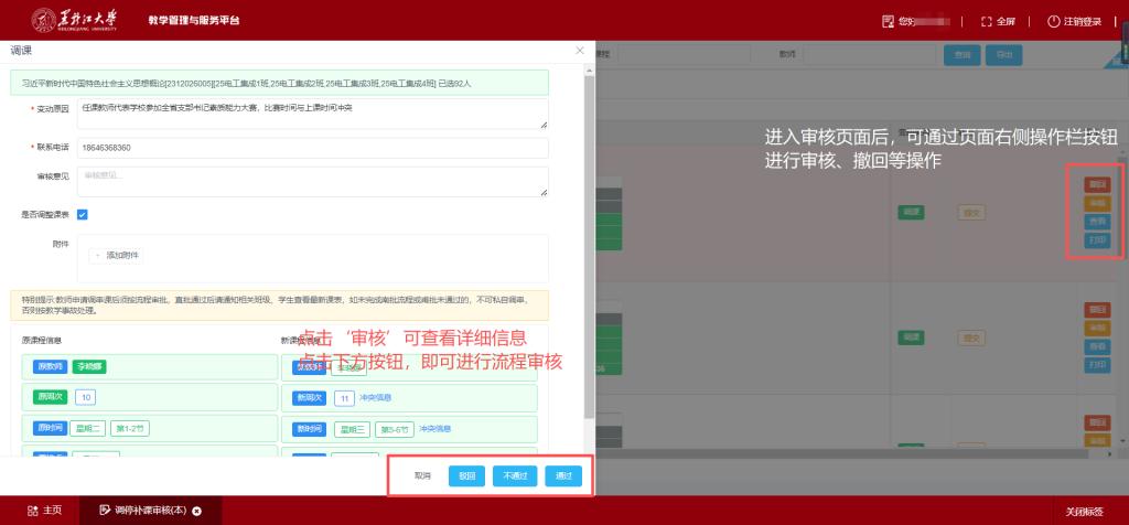 依据《黑龙江大学调、停课管理规定》以及《黑龙江大学本科生补(缓)考与重修实施办法》,教师的调停课申请以及学生的缓考申请,需由教学院长进行审批。学校在新版师生服务中,新增了教学院长针对教师调停课申请、学生缓考申请的院级审核流程操作功能。为兼顾审批的规范性与时效性,在该功能的基础上保留了教务员应急审批渠道。院级审核通过后,教务处将进行再次审核;若审核未通过,系统会驳回申请并详细说明理由。