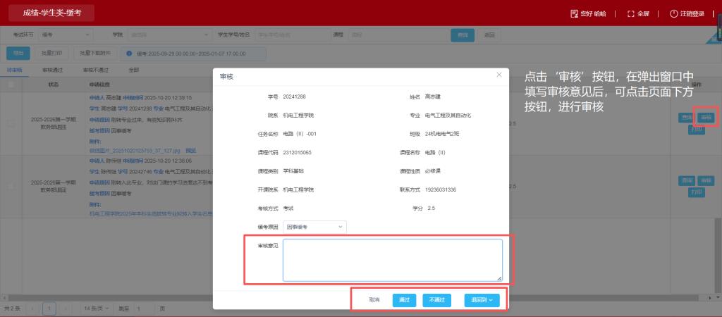 注意:教学院长需在1个工作日内,综合考量课程教学安排、学生学业情况以及申请材料,对调停课、缓考申请进行院级审核。