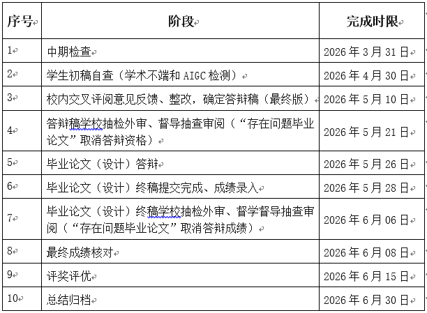 为切实提升毕业论文(设计)工作质效,严把毕业论文(设计)“出口关”,确保本科人才培养质量,现将2026届毕业论文(设计)各阶段时间节点通知如下: